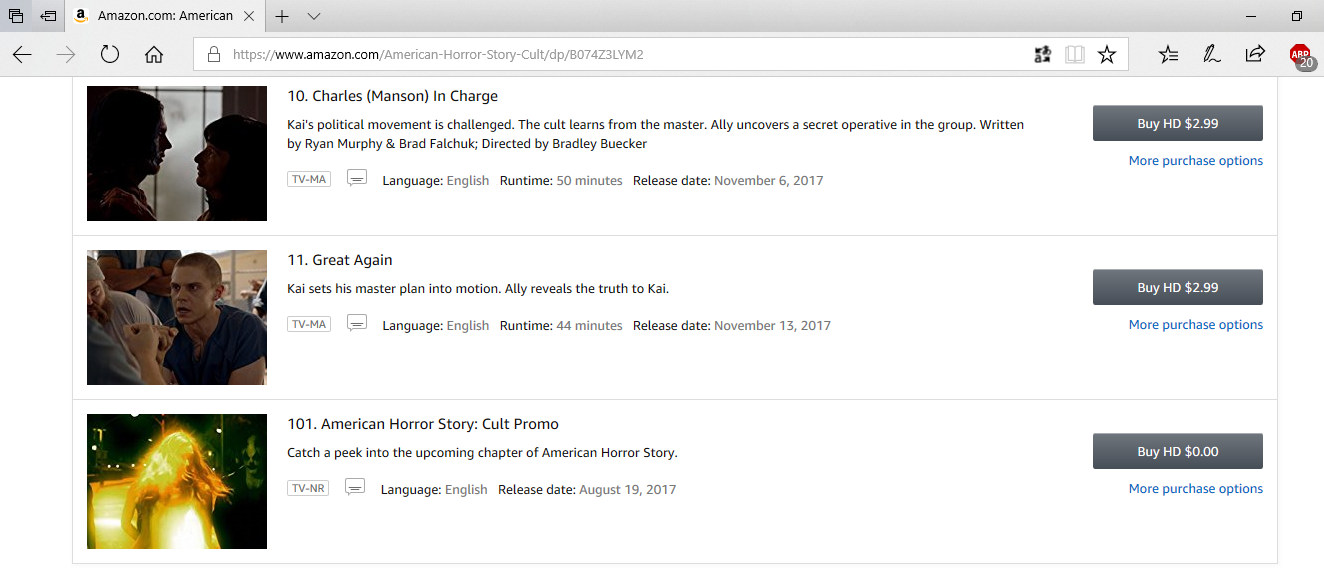 This disclaimer is in bold above the list of free videos. There is no way for it to be overlooked. Having a closer look at the product page again, especially if one scrolls down, there turns out to be a free video (if I may call it that) "American Horror Story: Cult Promo". So is this free Cult Promo a free video or is it not? For sure, Amazon.com tried to hide its existence in their arbitration brief by cropping the screenshot of the product page in their evidence. How sneaky is that!