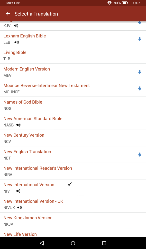 Bible Gateway is part of Zondervan, the publishers of the NIV and other Bible translations. The app includes all Zondervan Bibles, and many more. A full list can be found on the Bible Gatway website. The Bible Gateway app provides a solid set of translations and other resources, both for online and offline use.