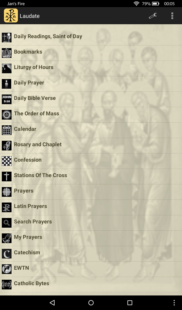The Roman-Catholic Church as the largest Christian denomination gets some special attention with the Laudate app (formerly CatholicOne) by Aycka Soft. This is a collection of many Catholic resources including two Catholic Bible translations, Vatican documents, prayers, liturgies, confessions, stations of the cross, the catechism etc. It is affiliated with the Roman-Catholic TV station EWTN, and can, therefore, also play the ETWN live stream, as well as streams of previous programmes.