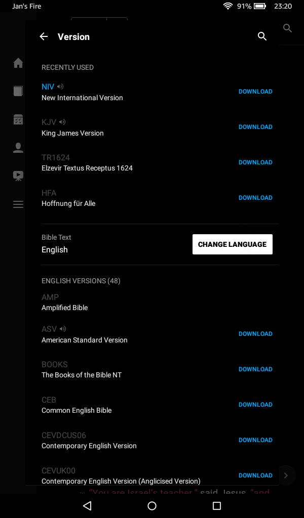 | Offline Bible Versions | English (ASV, CEB, CEV, CJB, CPDV, Darby, DR, ERV, ESV, GNB, GNT, GW, GWC, HCSB, ICB, ISR, JUB, KJV, LEB, MEV, MSG, NCV, NET, NIRV, NIV, NKJV, OJB, RV, TLV, WEB, WMB, YLT), Original Languages, 1000 more languages |