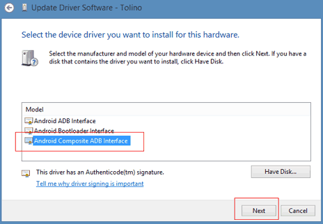 14. Selektiere das Android Composite ADB Interface aus der Auswahl, und bestätige die Installation.