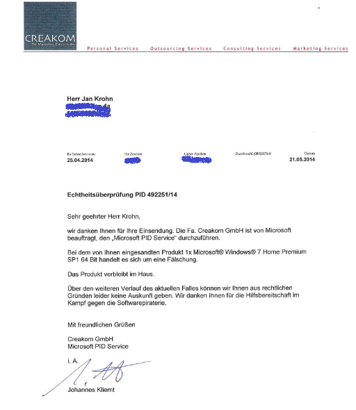 12. Mai 2014: Der Anruf beim Kundensupport liefert auch für diesen Fall neue Informationen. Es handelt sich um einen OEM-Key, der bisher drei Mal aktiviert wurde, zuletzt am 14. März 2013. Da es sich um ein gebrauchtes CoA handelt, sind die vorherigen Aktivierungen keine große Überraschung.
