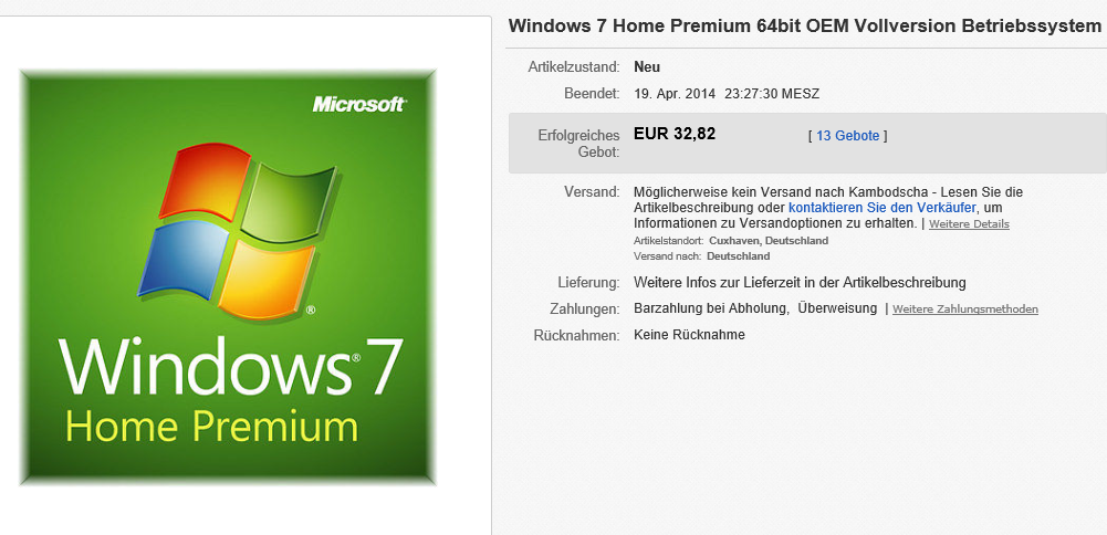 Fall 3: Windows 7 Home Premium von deutschem eBay Privatverkäufer