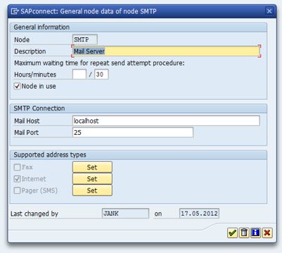 On the NetWeaver side, configuration is done in transaction SCOT (SAPconnect Administration). Maintain the node SMTP to go to the detail view.