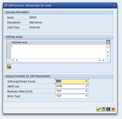 In the following screen select Address area *, and define output formats for SAP documents as follows: SAPscript/Smart Forms PDF, ABAP list HTML, and Business Object/Link, as well as RAW Text TXT.