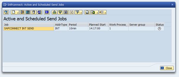 The following screen Active and Scheduled Send Jobs still presents an empty grid. Create a new periodic job by selecting Schedule job for INT. Assign a job name, AddrType INT, No. Work Processes 1, and assign a period, start time, and background user.