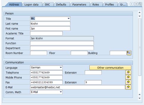 Before you test the configuration, maintain your user settings in transaction SU01. It's important to maintain your e-mail address, as well as set the communication method to e-mail.