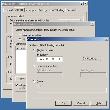 In the SMTP Server properties, navigate to the tab Access, and in Relay Restrictions press the button Relay. There you grant relay access to the server for the IP address 127.0.0.1 only. Unrestricted relay access is a severe security risk, so I strongly suggest not to leave this step out.